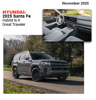The tested Santa Fe Hybrid was powered by a 1.6-liter turbocharged 4-cylinder engine paired with an electric motor powered by a 1.5 kWh lithium-ion battery pack for a combined output of 231 horsepower at 5600 rpm and 271 lb-ft torque from 1,000-4,100 rpm. Powertrain is mated with a 6-speed automatic transmission. Santa Fe’s cargo capacity is 14.6 cubic feet with third row upright, 40.5 cubic feet with third row folded, and 79.6 cubic feet with second and third row seating folded. Loading luggage, groceries and other items was super-easy since the SUV’s hands-free power liftgate has a wider opening than the prior generation vehicle. The tested 110.8-inch wheelbase Hyundai Santa Fe Hybrid Calligraphy with all wheel drive collects estimated mpg of 35 city and 34 highway and carries a base MSRP of $49,050.